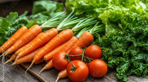 Fresh carrots, tomatoes, and lettuce arranged on wooden table. Healthy organic vegetables concept