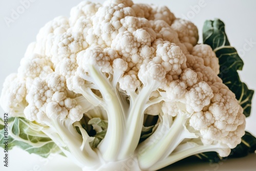 Fresh cauliflowers arranged on a clean surface, showcasing their intricate florets and green leaves in natural light
