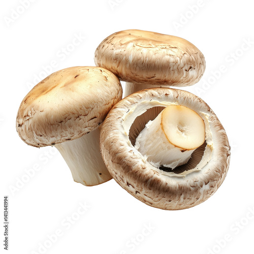 Fresh champignon mushrooms on a transparent background, showcasing their natural color and texture in closeup detail, Fresh champignon mushrooms on transparent background