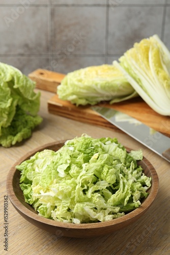 Fresh Chinese cabbages and knife on wooden table, closeup