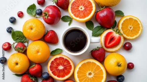 Fresh Citrus and Berries Surrounding a Cup of Coffee on a White Background for Healthy Lifestyle and Breakfast Theme
