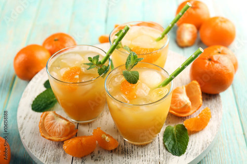 Fresh cocktails with ice, mint and tangerines on a white wooden board, close up