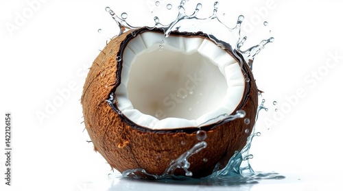 Fresh coconut half with splashing water isolated on white background
