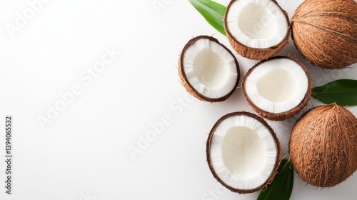 Fresh Coconut Halves on a Light Background with Green Leaves for Tropical Drink Inspiration and Hydration Ideas