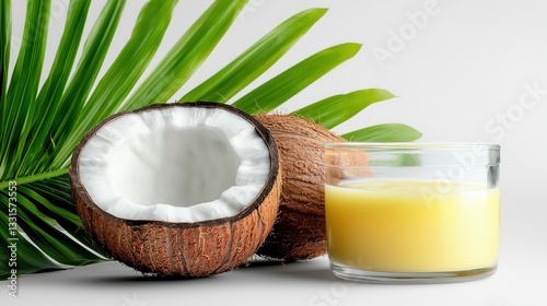 Fresh Coconut with Cream and Leaf on Neutral Background