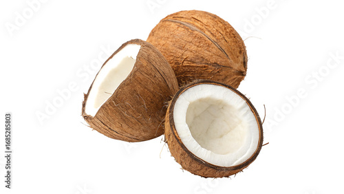 Fresh coconuts split open showing creamy interior ideal for tropical dishes and refreshments on a transparent background
