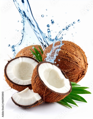Fresh coconuts with splashing water