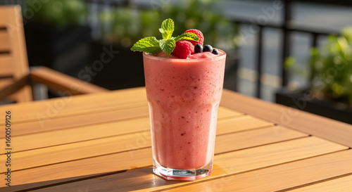 Fresh Cold Fruit Smoothie with Raspberry and Blueberry Outdoor on Table