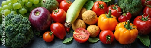 Fresh colorful fruits vegetables assortment on dark background. Healthy organic food ingredients for balanced diet. Vitamins, nutrition, raw produce. Vegetarian vegan food.