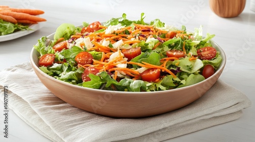 Fresh Colorful Salad with Cherry Tomatoes, Carrots, Lettuce, and Feta Cheese in Wooden Bowl