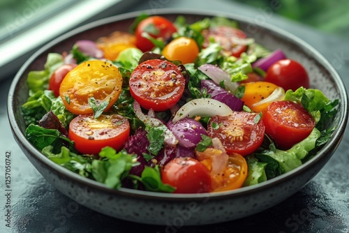 Fresh Colorful Salad with Olive Oil, Cherry Tomatoes, Onions, and Greens for Healthy Spring Diet