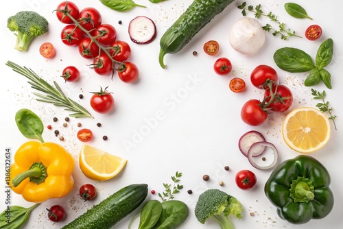 Fresh Colorful Vegetables and Herbs Flat Lay on White Background – Healthy Cooking Concept