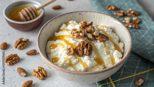 Fresh cottage cheese bowl topped with honey, nuts, and surrounded by almonds, captured from a top-down perspective in a cozy kitchen setting