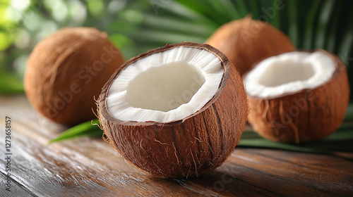Fresh, cracked coconuts reveal their creamy white flesh, surrounded by natural wooden textures and lush tropical foliage, capturing a serene moment in a vibrant setting