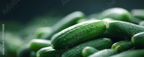 Fresh, crisp cucumbers with water droplets in a cool, moody tone. Perfect for culinary, healthy eating, or refreshment themes. Great for backgrounds or product promotion.