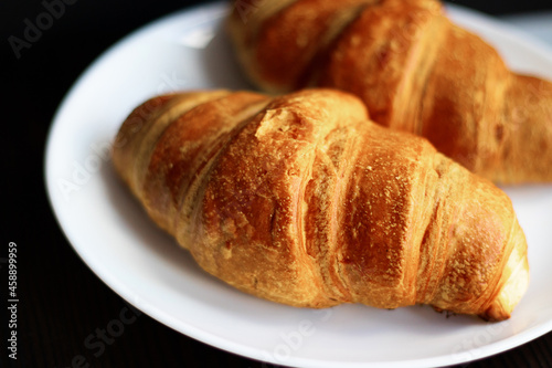 Fresh croissants on a white plate on a dark background