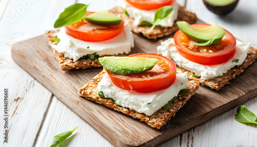 Fresh crunchy crispbreads with cream cheese, tomatoes and avocado on white background