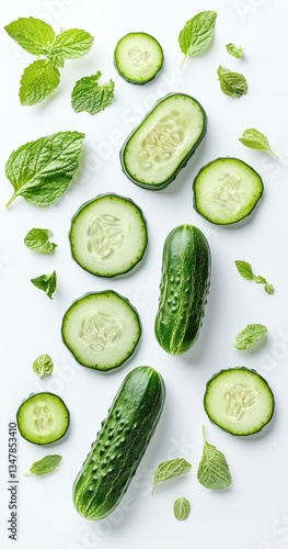Fresh Cucumber and Mint Leaves Arrangement on White Background for Healthy Cooking and Culinary Inspiration in Food Photography