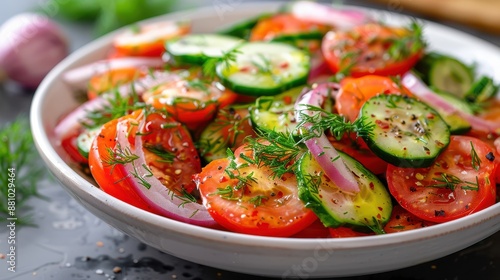 Fresh Cucumber and Tomato Salad with Red Onion and Dill in White Bowl High Detail