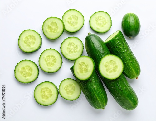 Fresh cucumber in white background, aesthetic and fokus slicing cucumber. Sliced cucumber showcasing its vibrant green and hydrating texture ideal for food photography, detox themes