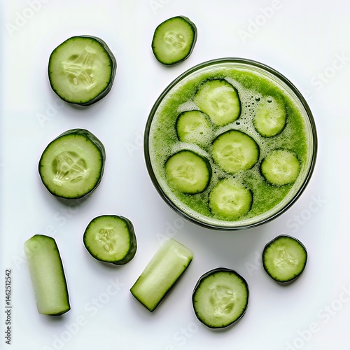 Fresh cucumber juice with sliced cucumbers on a clean white background.