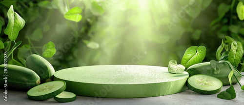 Fresh cucumber on a green podium surrounded by lush foliage, ideal for healthy lifestyle and culinary presentations.