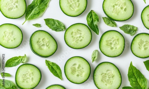 Fresh cucumber slices and basil leaves on white background; food, recipe, healthy eating