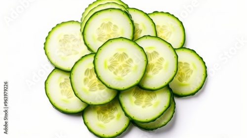 Fresh cucumber slices arranged on a white background for healthy cooking and dietary use