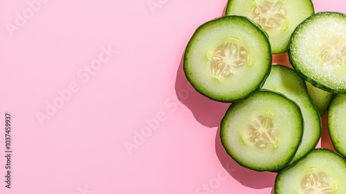 Fresh cucumber slices on a pastel pink background, showcasing their vibrant green color and unique texture.