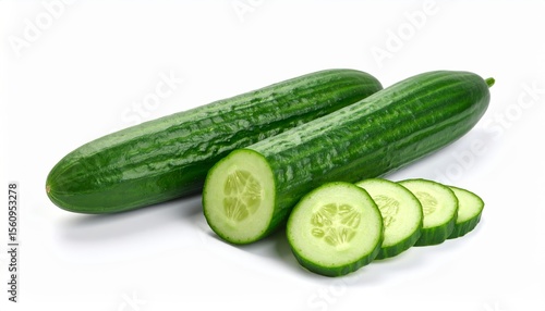 Fresh cucumbers: Two whole and sliced, showcasing vibrant green hues on a white backdrop