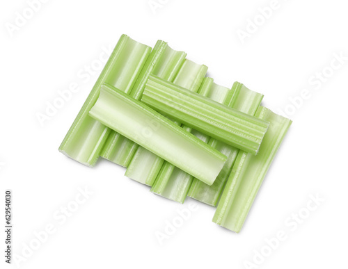 Fresh cut celery stalks isolated on white, top view