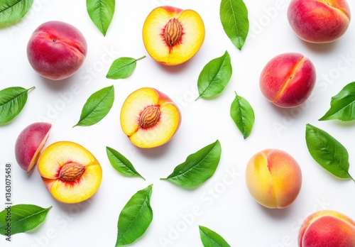 Fresh Cut Peaches with Juicy Flesh Surrounded by Vibrant Green Leaves on a White Background for Culinary or Health Themes