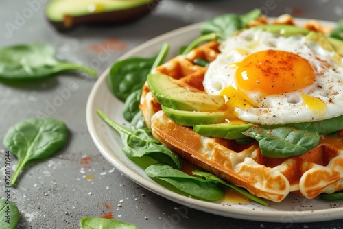 Fresh delicious and nutritious breakfast with waffles with spinach, fried egg and avocado pieces