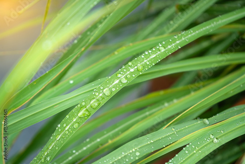 Fresh dew drops on vibrant green lemongrass leaves (Cymbopogon citratus). A refreshing macro shot capturing purity, vitality, and herbal freshness in nature.