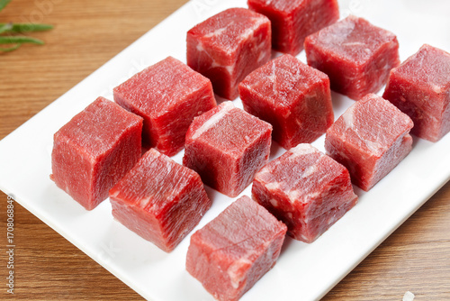 Fresh Diced Australian Beef Cubes Cut Raw Red Meat on White Board Ready for Cooking