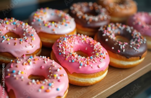 Fresh donuts with pink chocolate glaze colored sprinkles displayed in cafe. Delicious sweet dessert treats, bakery. Cafe window sale. Tasty breakfast meal. Confectionery, sugar product.