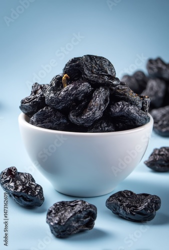 Fresh Dried Plums in a White Bowl on a Soft Blue Background, Highlighting Delicious and Nutritious Taste and Texture of Dried Fruits