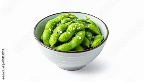Fresh Edamame with Sea Salt in Ceramic Bowl, White Background.