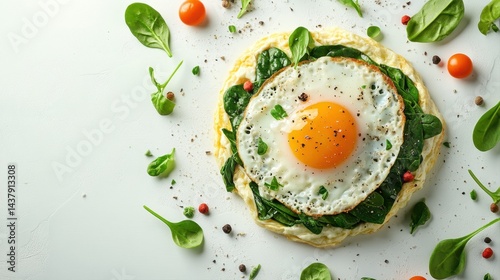 Fresh Egg on Spinach Bed with Cherry Tomatoes and Spices on Light Background for Healthy Meal Inspiration