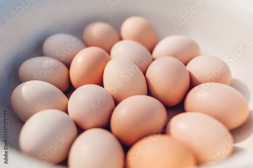 Fresh eggs collected in bowl. Organic product for healthy eating