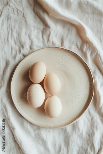 Fresh eggs on minimalist ceramic plate, top view, simple design, soft fabric background