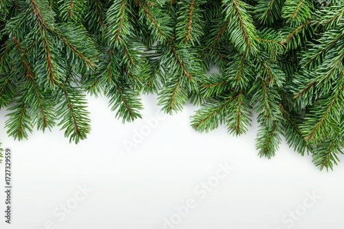 Fresh evergreen branches arranged against a white background