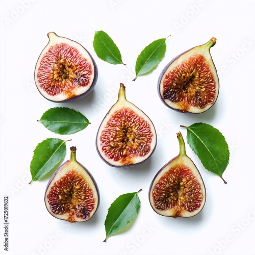 Fresh fig halves with green leaves on white background, flat lay food photography