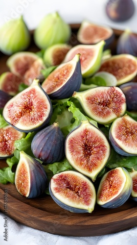 Fresh Figs on Wooden Plate, Halved Figs, Autumn Fruits, Healthy Food Photography