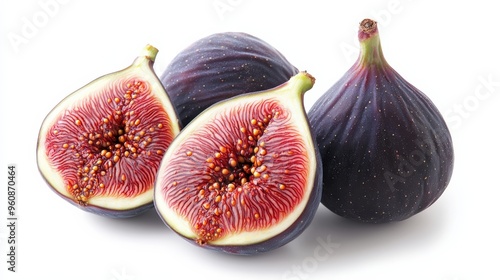 Fresh figs, whole and halved, showcasing their rich purple skin and red flesh, isolated on white, copy space