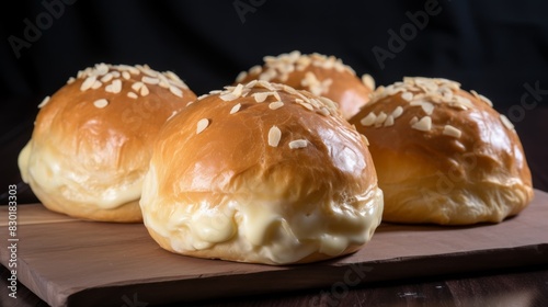 Fresh fluffy buns close-up at production in a bakery