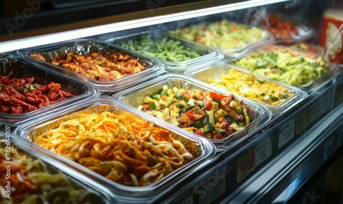 Fresh food items displayed in refrigerated section, vibrant colors