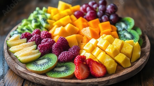 Fresh fruit platter, sliced tropical fruits arranged beautifully, vibrant colors, natural lighting, healthy eating theme, rustic table