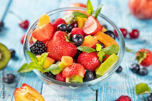 Fresh fruit salad served on wooden table