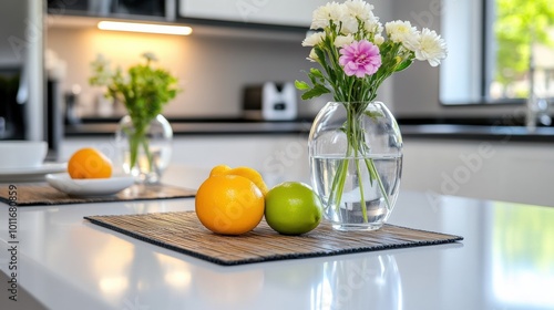 Fresh Fruits and Flowers on a Modern Kitchen Counter